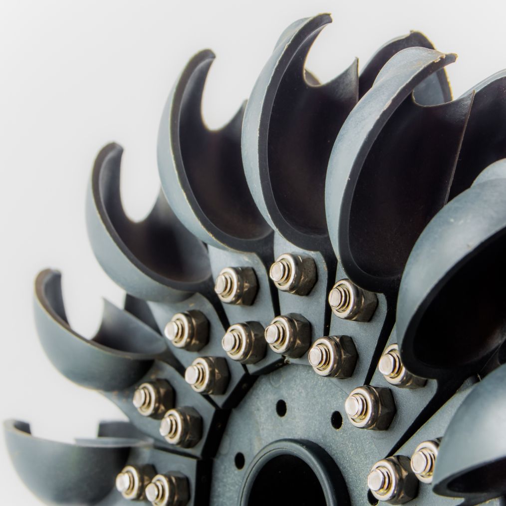 Nasze turbiny charakteryzują się grubymi, wysuniętymi do przodu łopatkami, które pozwalają rybom przepływać bezpośrednio przez turbinę, eliminując potrzebę stosowania drobnych siatek, nocnych wyłączeń lub innych kompromisowych rozwiązań. Dzięki zapewnieniu 98-100% przeżywalności ryb przy tej samej prędkości i wydajności co tradycyjne turbiny